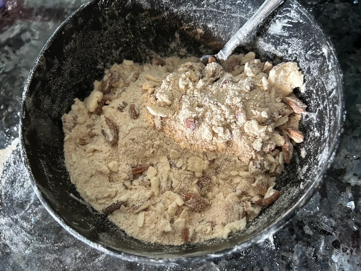- To make the streusel, combine flour, brown sugar, cold butter, chopped pecans, and a pinch of cinnamon. Cut together with a fork or pastry cutter until crumbly and clumpy.