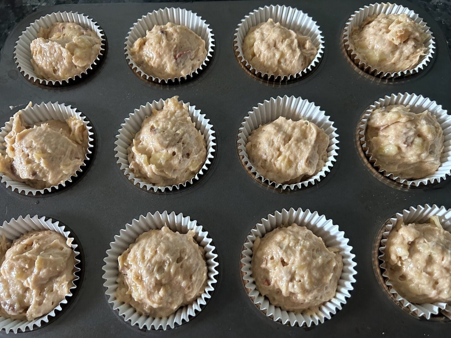 - Scoop batter into prepared muffin cups, filling each about ¾ full.