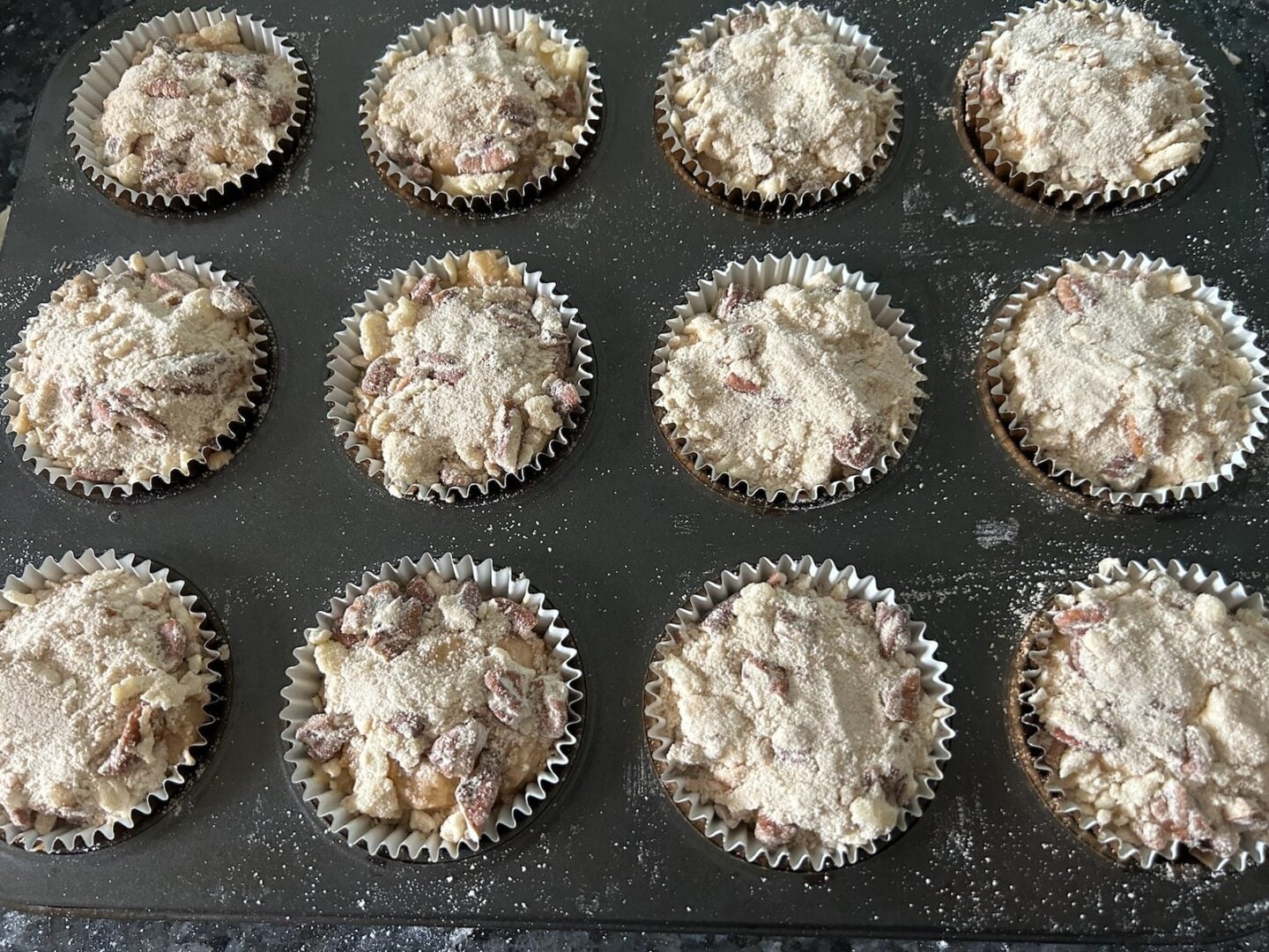- Sprinkle topping evenly over the muffins.