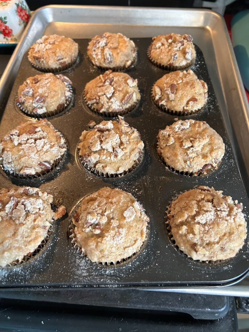 These muffins are everything I love about Southern baking in handheld form. They’re soft and tender, filled with fruit and pecans, and topped with a crisp, buttery pecan streusel that gives them just the right finishing touch. If hummingbird cake and banana muffins had a Southern little cousin, this would be it. (Did I mention these are over-the-top delicious?)