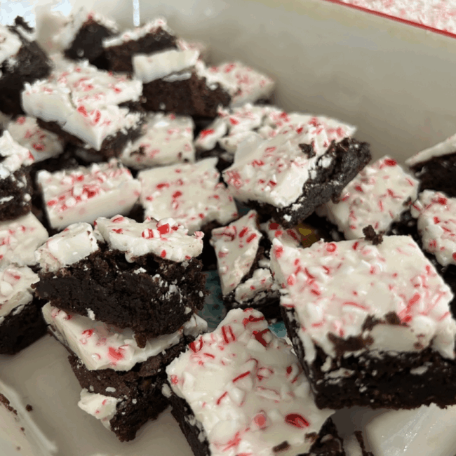 These Peppermint Bark Brownies are made with a boxed brownie mix, chopped Andes mints, and a crisp peppermint bark topping. An easy, festive chocolate dessert perfect for holidays, parties, and cookie trays.