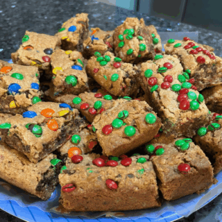 These soft, chewy Monster Cookie Bars are packed with peanut butter, oats, chocolate chips, and colorful M&Ms. This easy recipe feeds a crowd and bakes in under 30 minutes—no scooping required!
